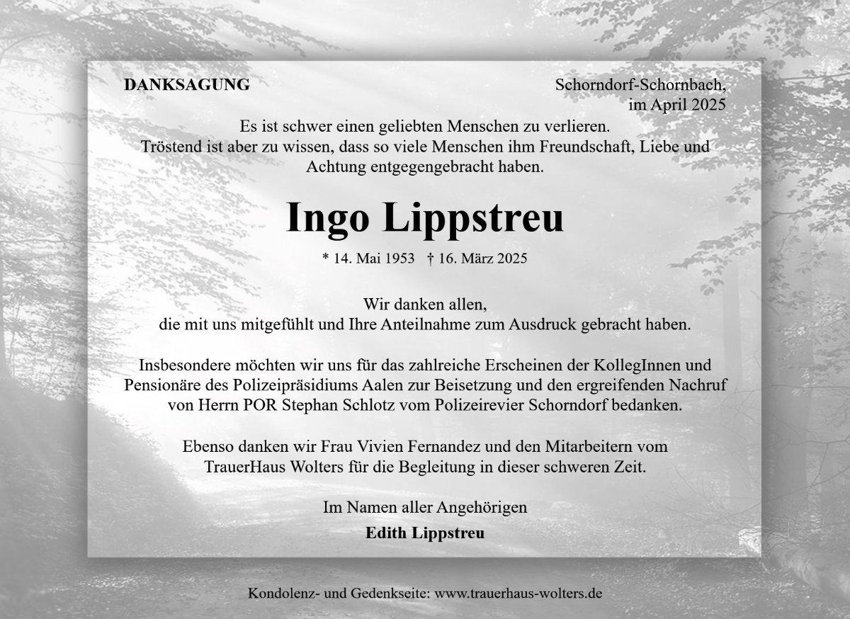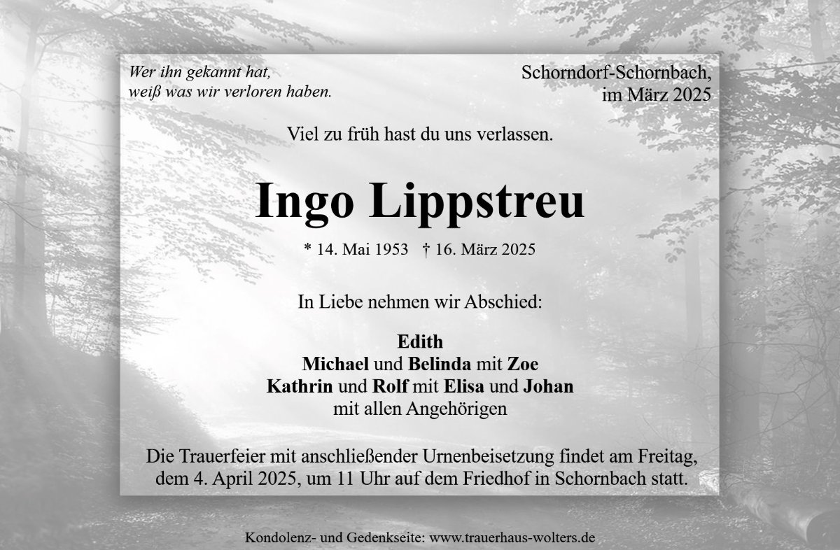 Das Schönste was ein Mensch hinterlassen kann, ist ein Lächeln derjenigen, die an ihn denken ! Liebe Familie Lippstreu mein aufrichtiges Beileid! Lieber Ingo... Ruhe in Frieden!