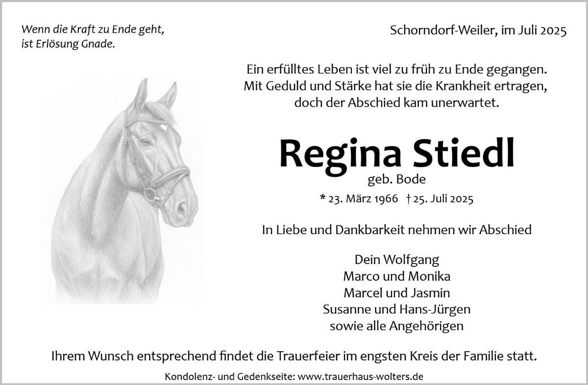 tief bestürzt habe ich vom Tode von Regina heute in der Zeitung gelesen.