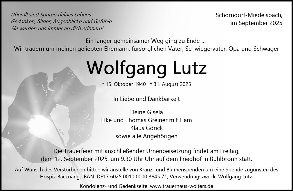 wir wünschen Ihnen von Herzen viel Kraft, dass Sie Menschen um sich haben, die Ihnen in dieser schweren Zeit beistehen und Halt geben. Zusätzlich können Sie auf dieser Gedenkseite Erinnerungen teilen und so das Andenken gemeinsam wachhalten.