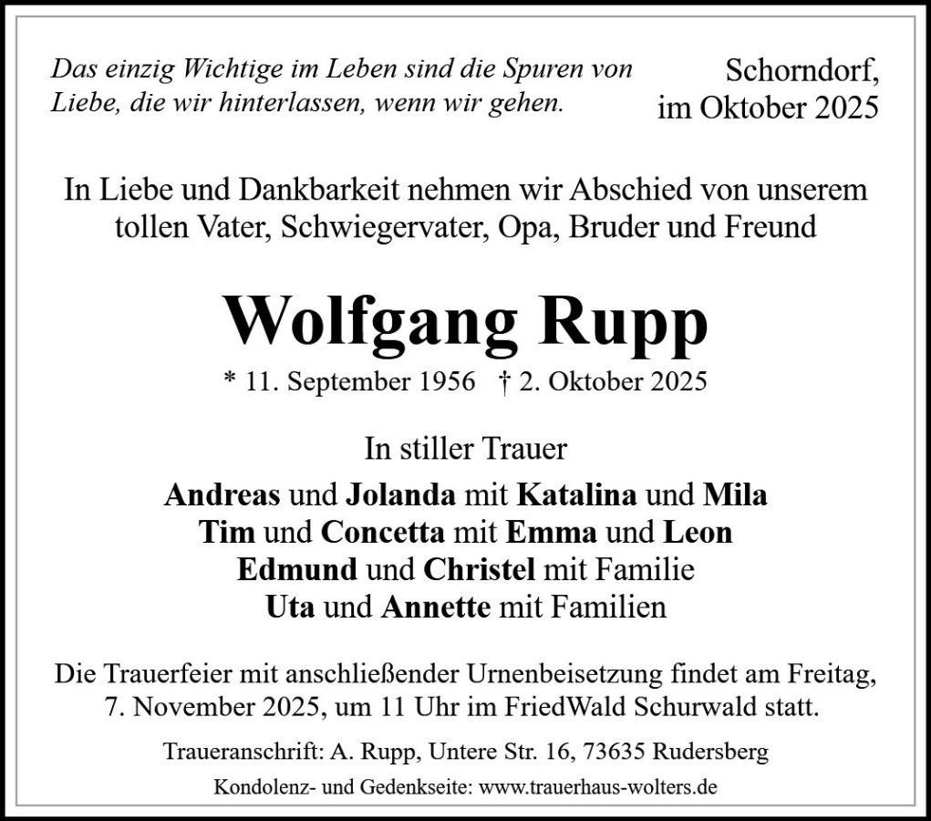 wir wünschen Ihnen für die kommende Zeit viel Kraft und dass es Ihnen gelingt, dankbar auf die positiven Erinnerungen zurückzublicken. Diese Gedenkseite möge Ihnen dabei helfen, Ihre Trauer zu teilen und das Andenken gemeinsam wachzuhalten.
